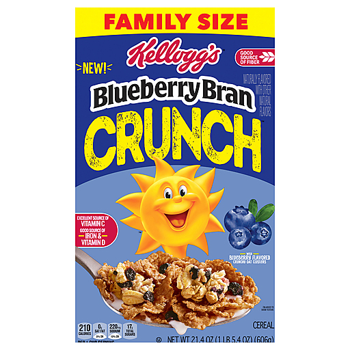 Wake up with Sunny and the goodness of Kellogg's Blueberry Bran Crunch, a deliciously crafted, wholesome breakfast cereal that helps energize the start of your day. This satisfyingly crunchy cereal is made with crispy, toasted, blueberry-flavored crunchy oat clusters balanced with the satisfying taste of sweet multigrain blueberry flakes in every spoonful. Kellogg's Blueberry Bran Crunch provides a good source of fiber and an excellent source of Vitamin C to help you start your day off right; Just as nutritious as it is delicious, this cereal is a healthy way to kick off your busy days. USDA Whole Grain-Rich, each serving contains 22g of whole grain per serving. Whether you enjoy this delicious cereal in a bowl with your favorite milk for a quick breakfast, sprinkled over yogurt for an afternoon treat, or as a crispy snack straight from the box after your workout, Kellogg's Blueberry Bran Crunch cereal lets you rise, shine and make the most of your day.