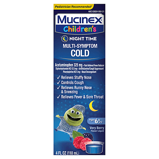 SYMPTOMS RELIEVED: Mucinex Children’s Night Time Multi-Symptom Cold helps reduce fever, relieves stuffy nose, sore throat, sinus pressure, nasal congestion, cough, and runny nose & sneezing