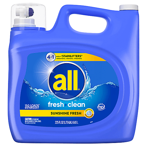 Grab a bottle of all with stainlifters Original liquid laundry detergent and enjoy the mess. Wanna play? all with stainlifters Original liquid laundry detergent tackles family-sized messes with a can’t-miss clean. It’s formulated to fight tough stains on all things ooey, gooey, and squishy. all Original liquid laundry detergent’s 4-in-1 cleaning power fight’s your family’s toughest stains whitens, brightens, and leaves your clothes smelling clean with a fresh scent. It is safe to use in any high efficiency (HE) washing machine and it cleans effectively in cold water. all laundry detergent is great for all types of clothes, including activewear. With the 4-in-1 cleaning power of all stainlifters laundry detergent, you don’t have to think twice about jumping in that puddle or slurping that spaghetti. In fact, the messier the better. These detergents were made for putting life before laundry. So, toss an armload of whatever in the washer. You’re all good. This package includes one 225-ounce bottle of all with stainlifters Original liquid laundry detergent, enough for 150 loads of laundry.